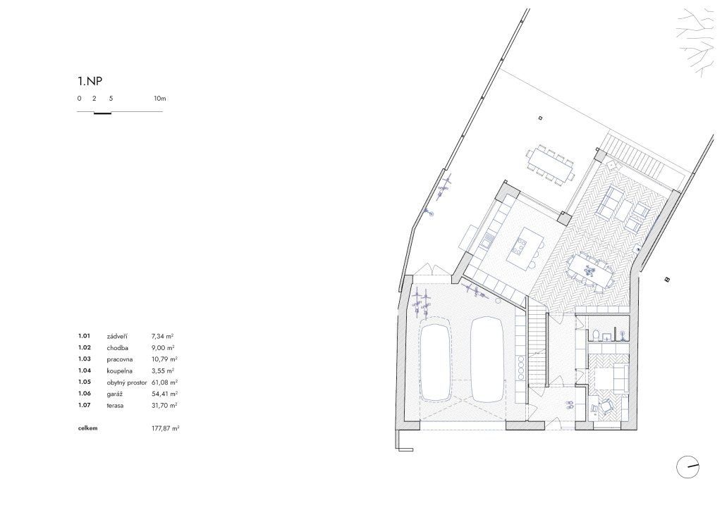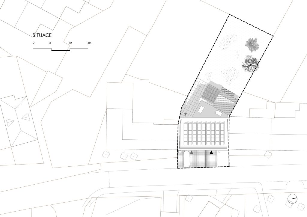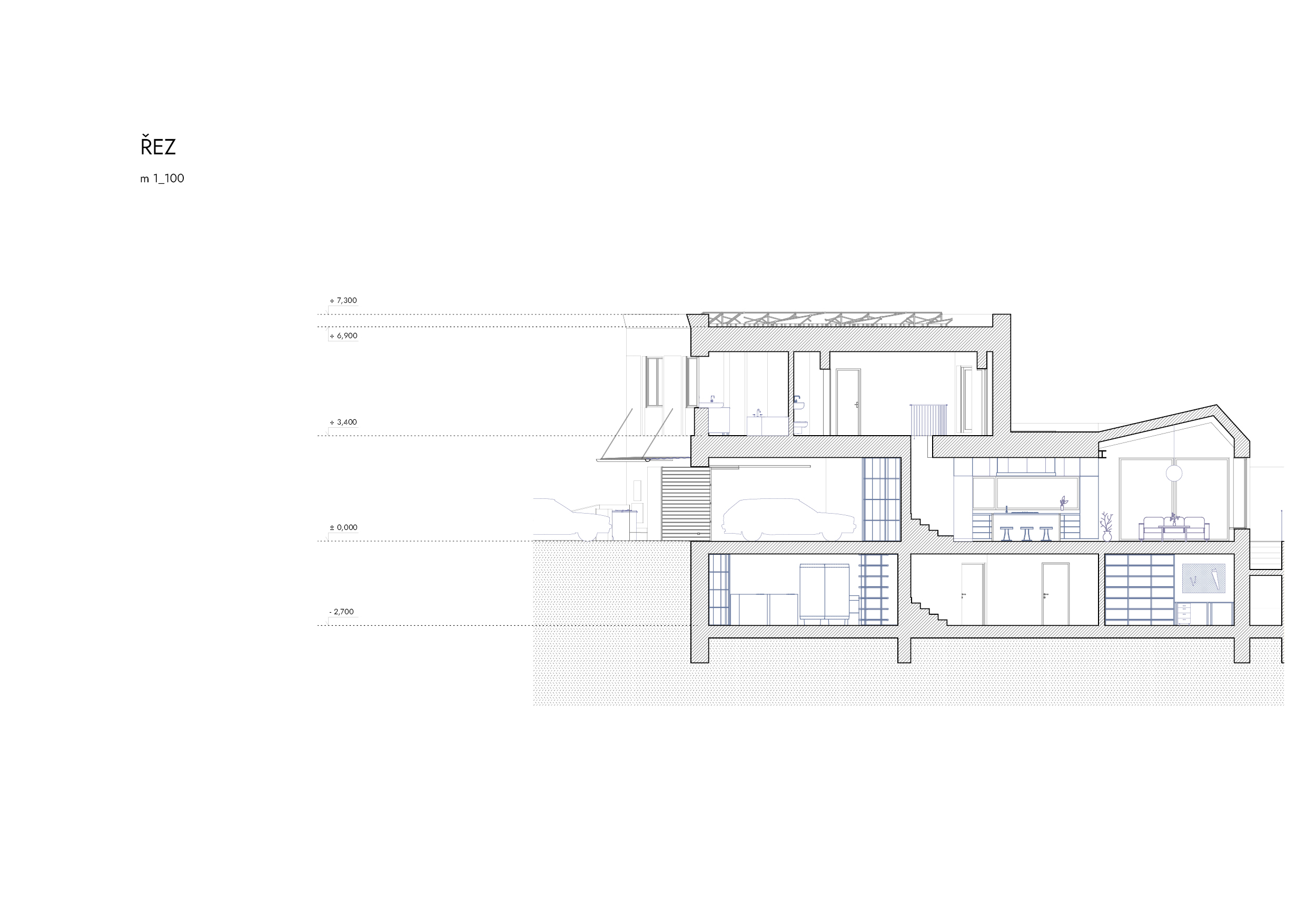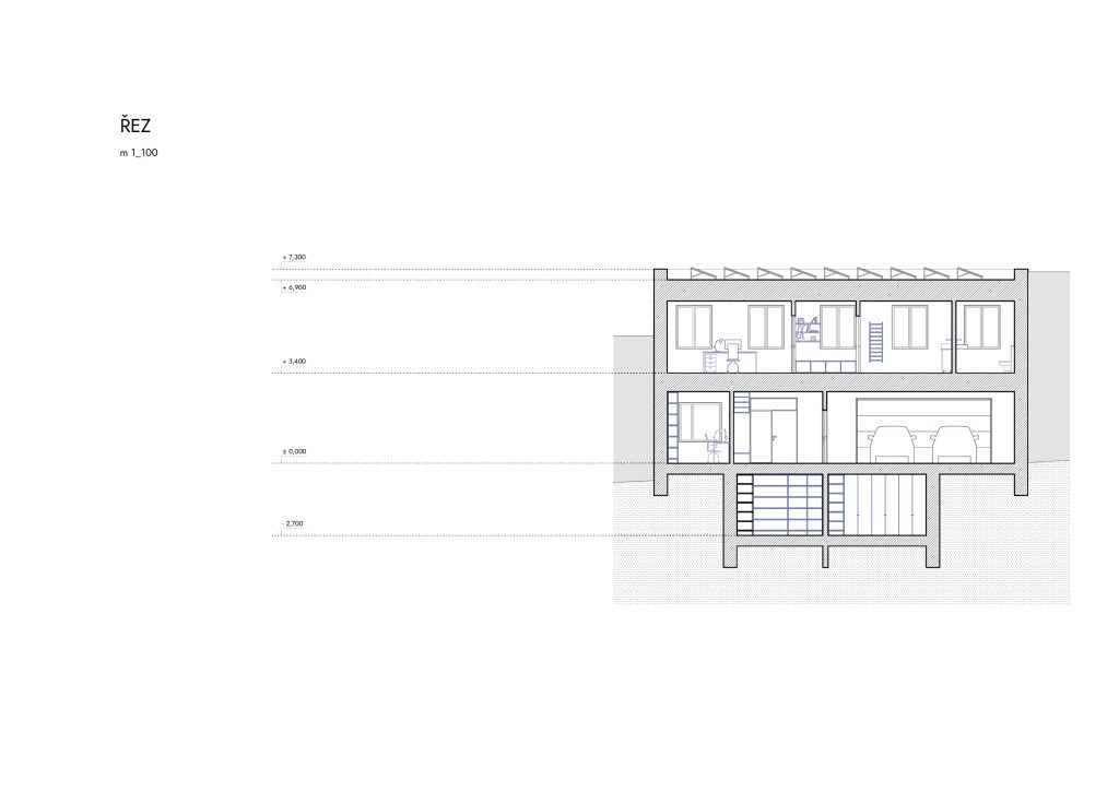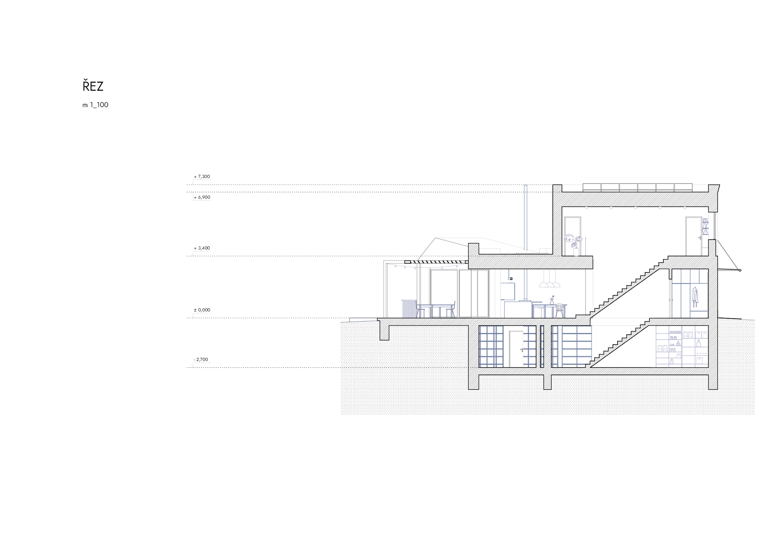 Vracíme se z procházky Vinohradskou. V uších ještě doznívají tóny cimbálu, ale my už vidíme náš dům. Vyplnil místo v řadě, které bylo dlouho volné, ale teď vypadá, jako by tam stál odjakživa. Z ulice je vidět hlavně pevný řád oken prvního patra, který zjemňuje zvlněná omítka mezi nimi. Pomněnková modř jejich