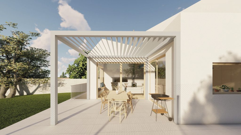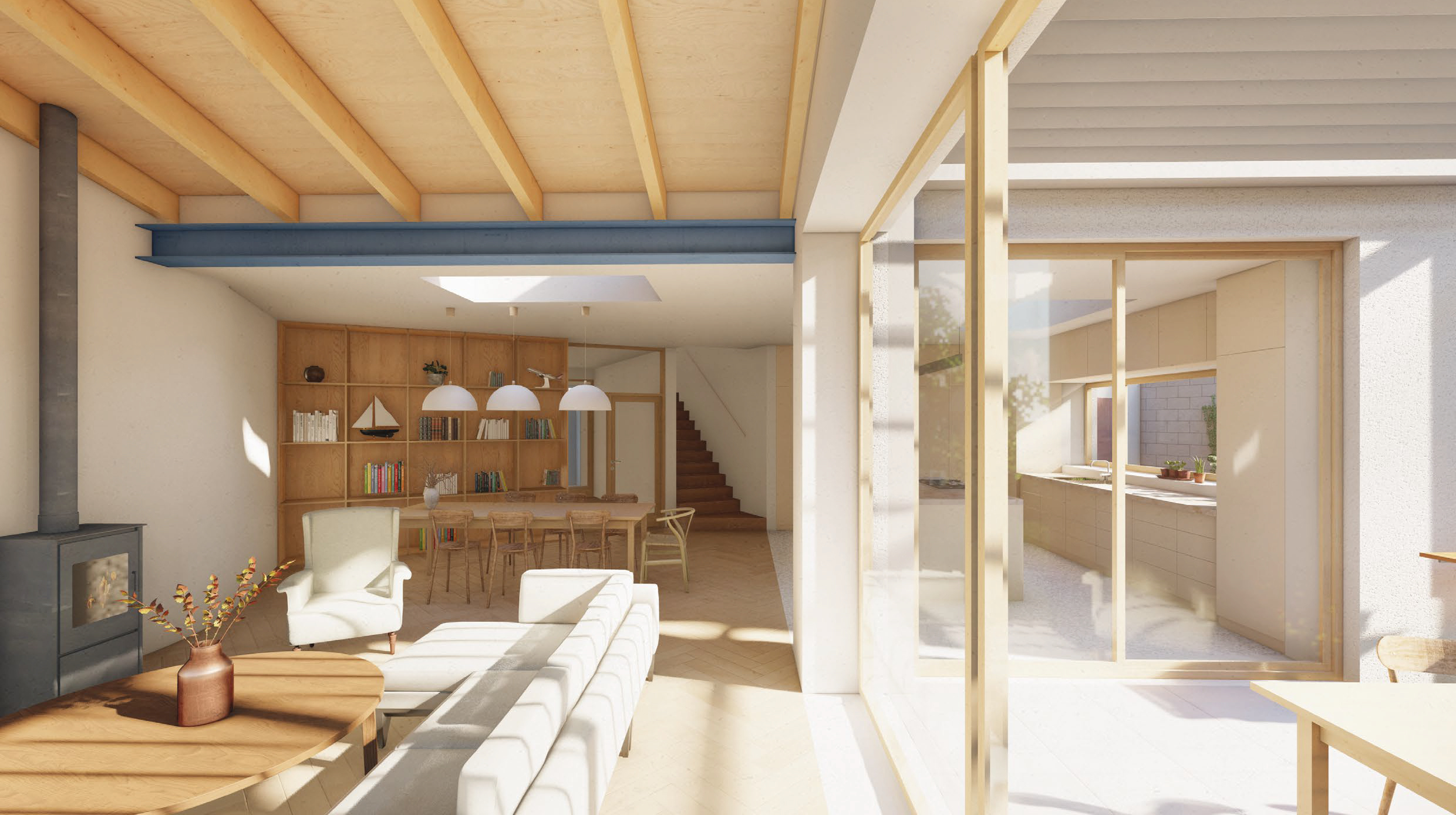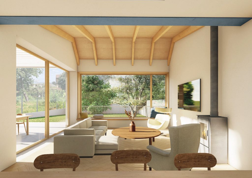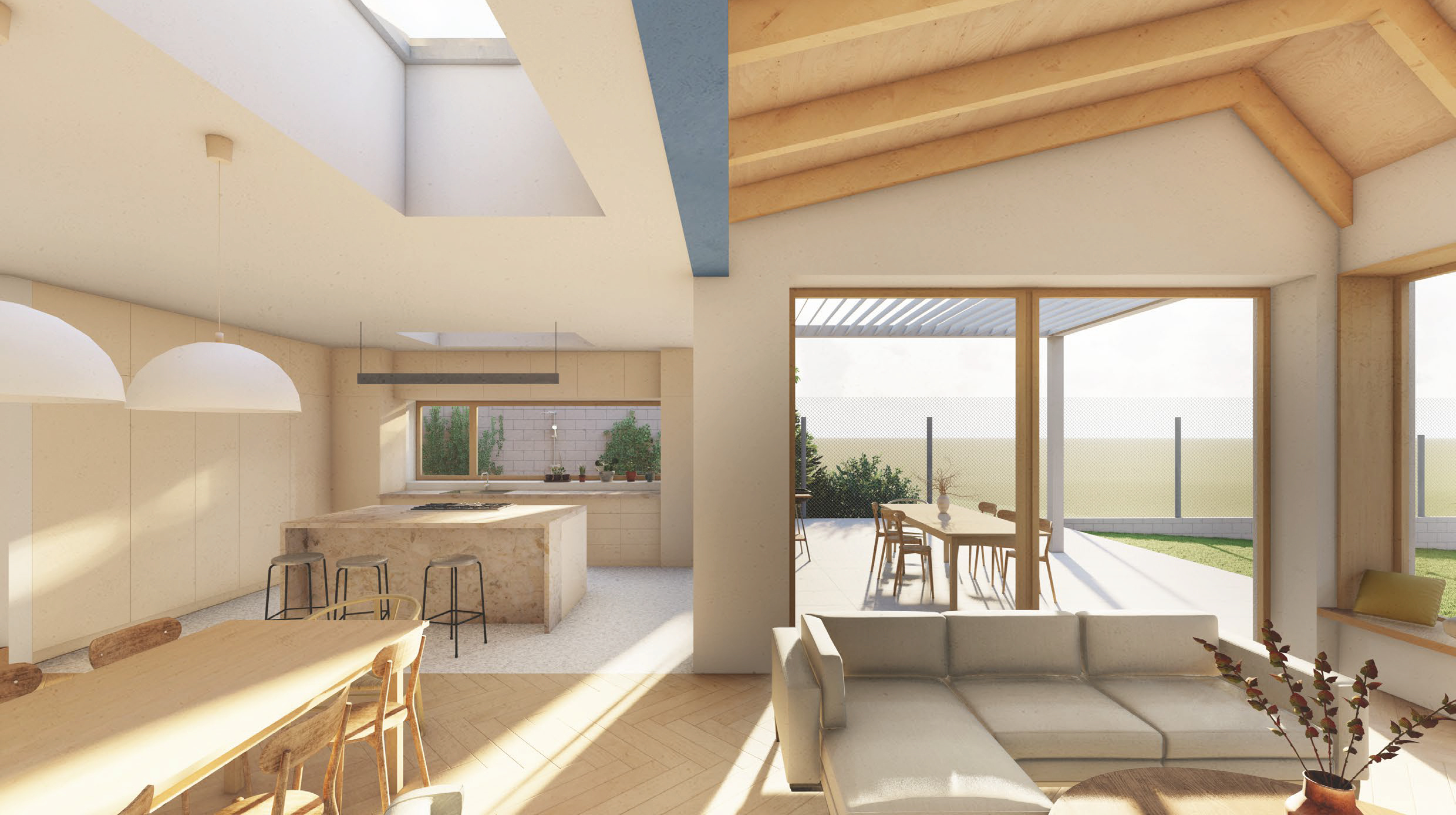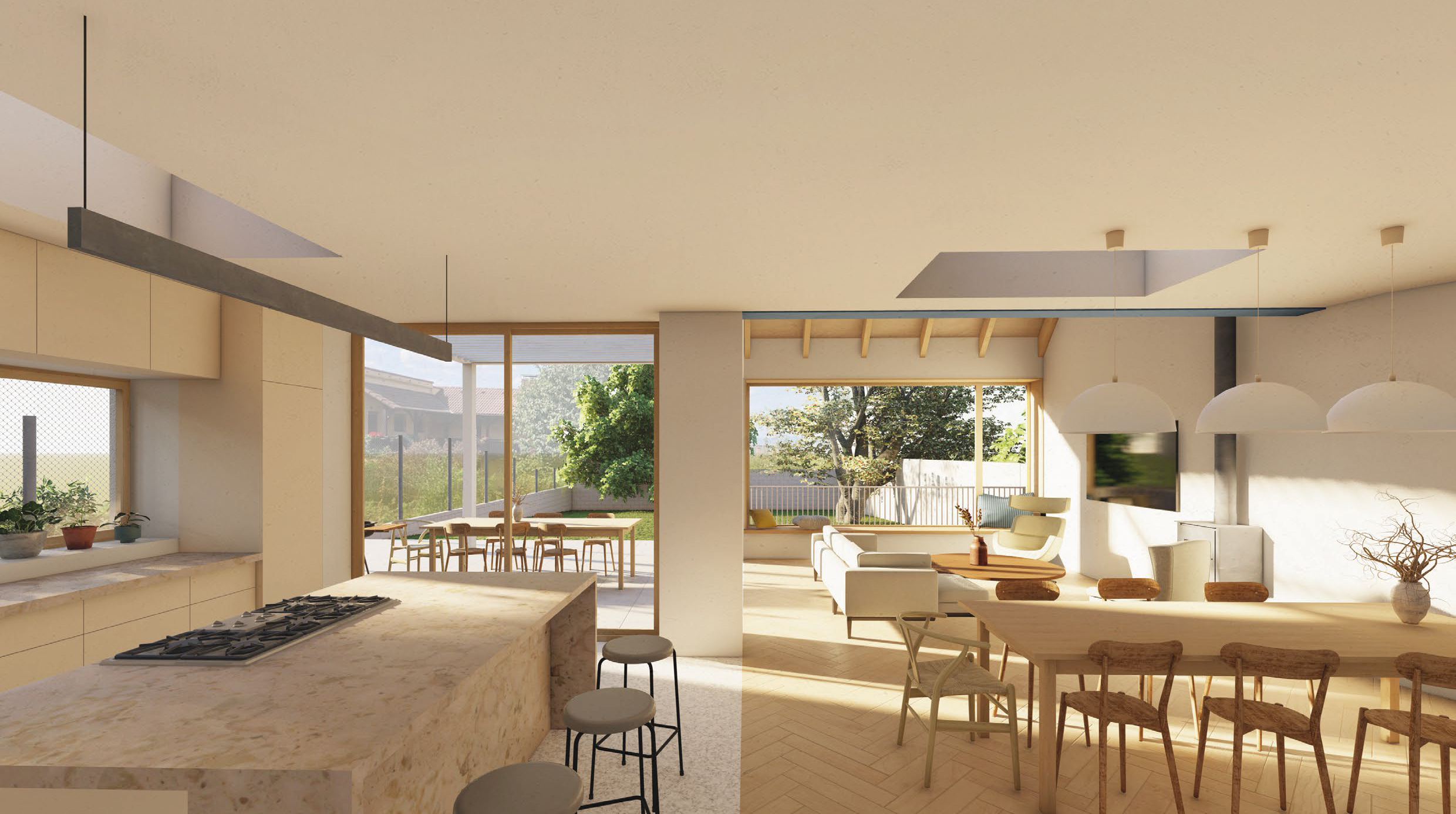 Už ze zádveří vidíme zahradu a paprsky západního slunce procházející kuchyní. Za chvíli v kamnech